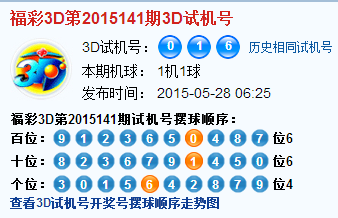 本期3d试机号的号码是016,本期继续看好胆码6,从试机号试开走势图来分析,本期重点看好偶数号球,本期看好开出两偶一奇比。