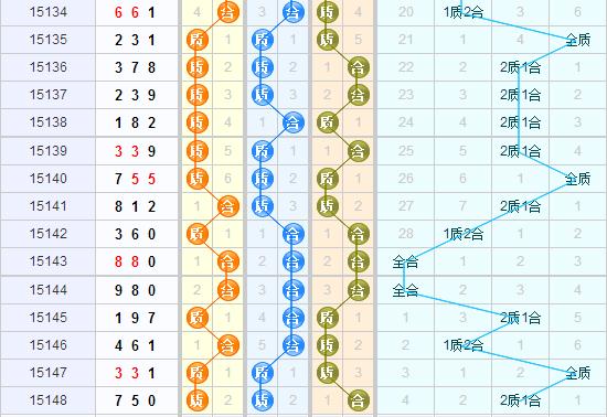 根据质合走势图来看,上期开出的是2质1合的形态,近期质号球比较热门,上上期还开出了全是质号球的类型,但是根据连线走势图来看,在逐渐的往左移,也就是合数号球在慢慢回暖,本期推荐关注合号球的开出。百位上已经连续两期开出了质号球,而前几期只是开了一期质号球变成了合号球,所以本期百位看好合号球的开出;纵观十位近十五期开出的情况,每次开出质号球以后都是连续3期以后才转为合球,所以本期期待质号球的继续开出;个位上近十五期质号球与合号球的比为8:7,本期看好合号球的开出,然后质号球与合号球的比就能平衡为1:1.综合以上本期推荐形态:合质合,合合质。