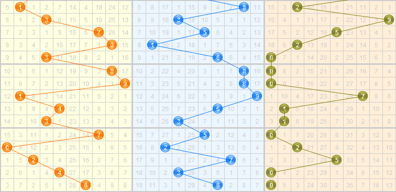 四、和值分析:最近几期开出的和值分别是12-4-14-7-13,可以看出,近5期的和值是第一区域和第二区域交替开出,预计本期和值会向左移动,推荐本期关注7-12区间的和值。