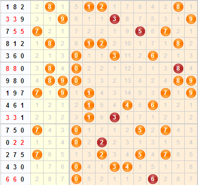 和值分析:上期开出了和值12,开在了第二区域内,近期有第一区域和第二区域轮流开出的规律,本期重点看好在第一区域开出,其中和值8已经遗漏65期了,可重点关注,结合走势,综合分析和值关注:7、8、9、10、13、15。