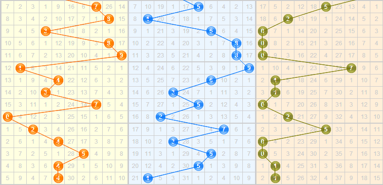 上期开出的和值是6,上期开在了第一区域,近5期有2期和值开在了第一区域,本期有可能还会在第一区域开出,其中和值8都已经遗漏很多期了,可进行关注。结合走势,本期推荐关注和值:8、9、11、13、15、16、17、18,重点看好8、9、13、15。