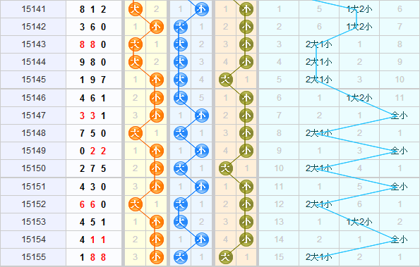 根据近15期的大小走势来分析,百位上近15期大小号走势小号明显强势,上期开出的是小号,近5期有4期开出了小号,结合近期走势,本期看好百位继续开出小号。十位上大小号走势大号明显强势,上期开出的是大号,近5期大号有3期,本期看好继续开出大号。个位上近15期大小号走势小号明显强势,上期开出的是大号,结合走势,近期个位有开4期小号1期大号的规律,本期看好转为小号开出。