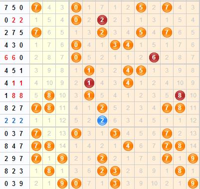 上期开出了组六形态,结合走势看,本期继续看好开出组六类型。上期又开出了3号球,开出重复号是比较常见的现象,3号球连开了2次,本期再开的可能性不大,所以本期重复号可关注0号球和9号球;8号球是个隔期号,又是上期开奖号码9的邻码,本期有机会开出;7号球在近15期内走势比较热,且已经隔了两期,本期有开出的可能;上期又开出了个斜连号789,近期斜连号开的也比较多本期可关注斜连号4号球;2号球也是个隔期号,且2号球的走势较暖,又是上期开奖号3的邻码,本期可关注;剩下分析请往下看。