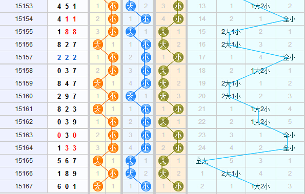 十位上:近15期,大号球开出期数5期,小号球开出期数10期,比例1:2,说明小号球近期比较热门,而且上期开出小号球,本期看好继续开出小号球;
