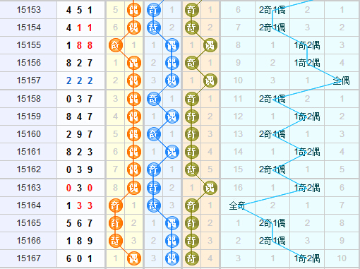 个位上:近15期,奇号球比较热门,到上期已经连续开出4期奇号球,15期中,奇号球开出最多期数是5期,本期预计继续开出奇号球;