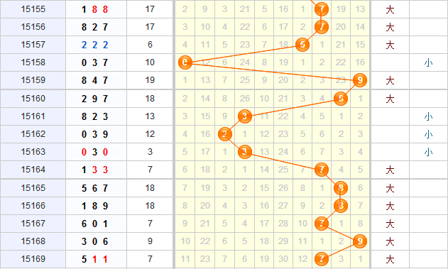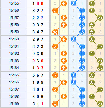个位上:近15期,大号球开出9期,小号球开出6,大小比例9:6,舍利子预计本期开出大号球;