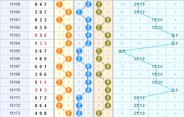 百位上:百位上上期开出的是小号球,近期百位上大小号球基本都是交替开出的,出了中奖开出过一次两期的大号球,所以本期看好大号球的开出;