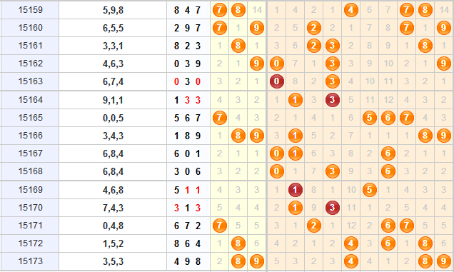 和值分析:上期开奖号为498,和值为21,开在第三区域内,观察近十五期内和值只有两期是开在第三区域内的,预测本期和值会向左走在第二区域内开出,本期和值区间推荐11-17.