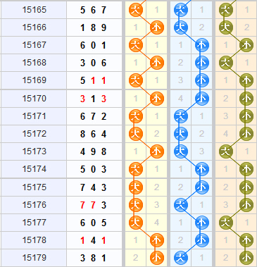 上期开出的和值是12,近期和值的走势比较分散,但大部分开在了第二区域,推荐本期可继续关注该区域的和值,结合走势,本期推荐关注和值:10、12、13、15、16、17、18
