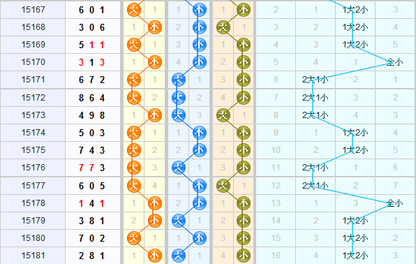 根据近15期的大小走势来分析,近期百位上大号球的总体走势比小号球热一些,但近期小号球走势回暖,4期中开出了3期,本期看好小号球的继续开出;十位上近期大小号球交替开出,上期开出了大号球,本期十位上看好小号球的开出;个位上小号球的走势很热,上期开出了小号球,小号球连续开出了4期,近15期小号球最多连续开出4期,本期个位上看好大号球的开出。结合以上分析,本期苏会文大小形态推荐:小小大、大小小、小大小。