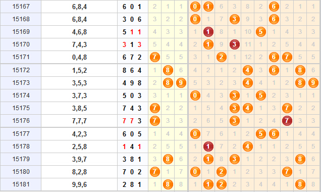奇偶分析:近十五期百位上偶数球都是隔三期开出,目前开出一期偶数球,本期看好偶数继续开出来;十位上近十五期开奖号奇偶比例5:10,偶数球走势较热,目前已经连续开出五期偶数球,本期看好奇数球的开出;个位上近十五期开奖号明显是奇数开出比较多,本期看好个位奇数球继续开出;综合推荐两奇一偶形态。
