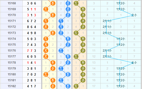 根据近15期的大小走势来分析,小号球的走势比较热,连续开出了4期1大2小,预计本期小号球走势会下滑,转为开出大号球,本期看好大号球的继续开出;百位上近期都是开出两期小号球之后转为大号球,上期开出的是小号球,本期看好大号球的开出。十位上近期大小号球交替开出,上期开出的是小号球,本期看好大号球的开出。个位上开出4期小号球之后转为大号球,近期个位上大号球没有连续开出的情况,本期看好小号球的开出。结合以上分析,本期苏会文大小形态推荐:大大小、大小小、小小大。