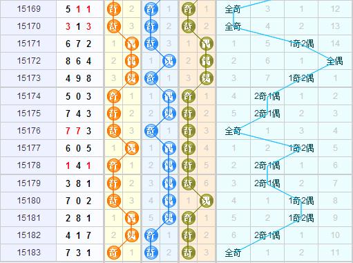 上期开出了全奇形态,近15期中全奇开出了4次,全偶开出了1次,另外的2奇1偶开出了5次,1奇2偶开出了5次,看来还是奇数号比较走热,本期的话预计还是奇数号走热,可以重点关注2奇1偶的形态开出来。