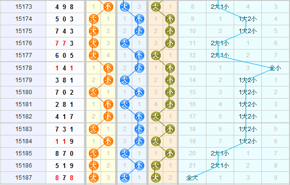 根据近15期的大小走势来分析,近期大号球的走势回暖,连续3期都是大号球开出比较多,预计本期大号球的走势会有所减弱,转为开出小号球,本期看好小号球的开出;百位上近期大号球连续开出了3期,预计本期不会继续开出,本期看好小号球的开出;十位上近期大小号球交替开出,上期开出的是大号球,本期看好小号球的开出。个位上开出近期大号球的走势比较热,6期中开出了4期大号球,现在连续开出了两期大号球,本期看好大号球的继续开出。结合以上分析,本期苏会文大小形态推荐:小小大、大小小、小大小。