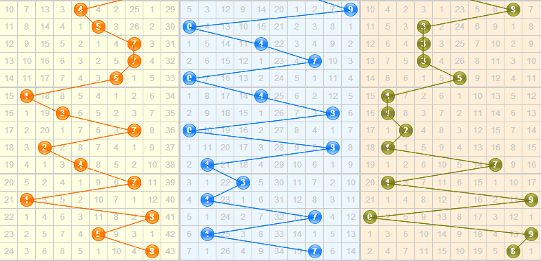 个位上:7号球是8号球和9号球的斜连号,预计本期开出斜连号的可能性比较大,推荐关注。9号球在近4期都是隔期开出,本期看好9号球的隔期开出。1号球在近10期里开出过4期,开出间隔均为1期,到本期已经间隔4期,预计本期开出1号球的可能性比较大,推荐关注。