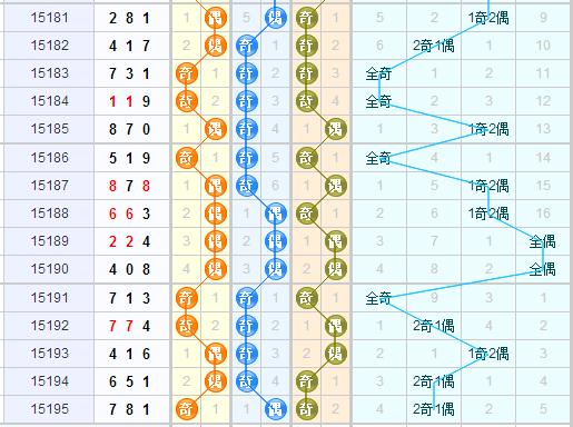 上期3D第2015195期的开奖号码是781,组六组合,2奇1偶,大大小,012路号码是121,和值是16,跨度是7。