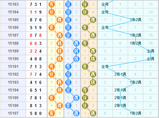 结合3d之家3d奇偶走势图近15期走势来看,百位上近期奇偶号球交替开出来,前面是两期交替开出,近期周期变为1期,上期开出了奇号球,本期看好偶号球的开出;十位上近期连续开出4期奇号球后,走势变为奇偶号球交替开出来,上期开出来的是偶号球,本期推荐关注奇号球的开出;个位上上期开出的是偶号球,而且是奇号球连续开出3期之后开出来的,近10期偶号球都是两期两期开出来的,本期看好偶号球的继续开出。本期奇偶综合形态分析:偶奇偶,奇偶奇。