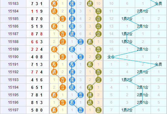 根据质合走势图来看,上期开出的是质合合形态,近15期的数据来看,2质1合开出的稍微多一些,10期中开出了5期2质1合,3期1质2合。近5期内连续开出3期2质1合后开出1质2合,预计1质2合走势会有所上升,本期看好1质2合的继续开出。综合以上本期推荐合质合、质合合。