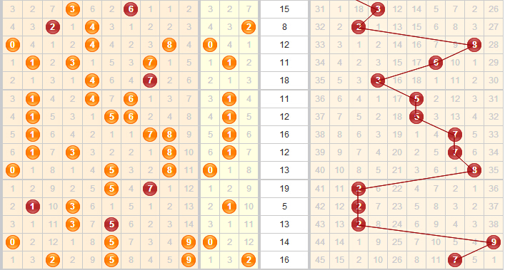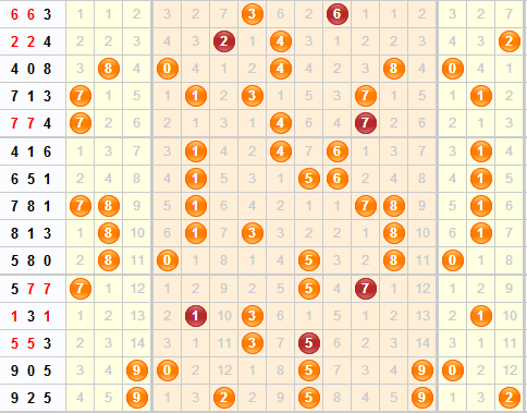 跨度分析:近期跨度变化很大,第15200期的2直接跳到第15201期的9,第15202期又从9跳到了7,起伏很大,但是有稳定的趋势。本期可以继续关注7,也可以多关注一下7附近的值6和8。