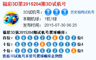 福彩3d第2015204期3d试机号号码是894