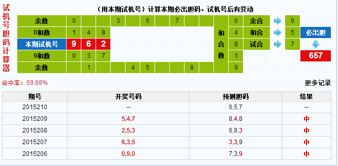 3d之家3d试机号胆码计算器推荐657,近期的试机号胆码计算器都有预测中,所以本期的话可以关注一下试机号胆码计算器的推荐,重点关注6号球跟7号球的开出。