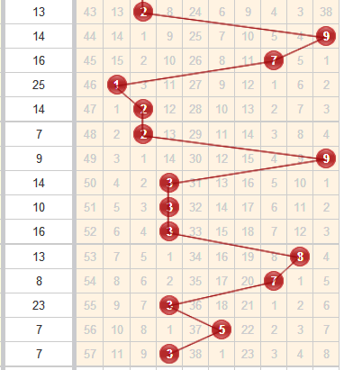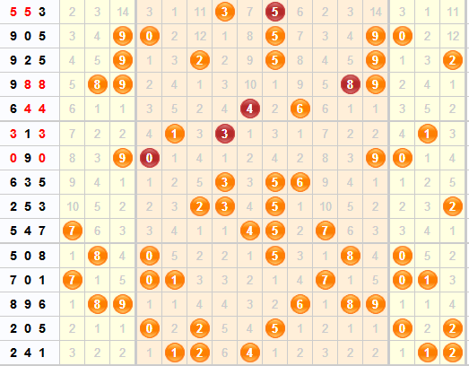 上期开奖号码为241,出了三个小号,跨度比较小。从走势图上可以看到近15期中跨度都是以跨度为分界线,近期更是以4为中界线左右摆动。本期跨度推荐:2 3 5 7