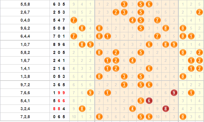 跨度分析:上期的开奖号码为065,跨度为6.在经历了跨度8到跨度1的大范围跨度变化后,接下来几期,跨度的变化都不会特别大,上期的跨度为6,预计本期的跨度不会和跨度6相差太大,并且,最近相同跨度连续出现的次数很小。本期跨度预测:3457