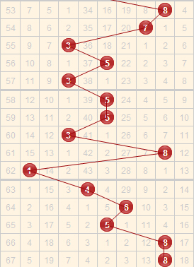 和值分析:同样的我们也可以看到近期的和值和跨度是正好相反的走势,从大和值一直开到小和值,在和值9这里停留了一期。如果本期和值继续往小开,很可能开往8,反之则会往大的开。