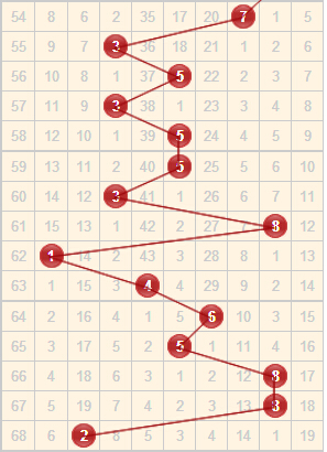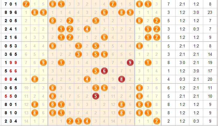 跨度分析:近期跨度跳动比较大,分析跨度走势图上可以看到,跨度走位如钟摆一般,分析近15天走势本期跨度选中间地段,推荐跨度:2 4 5 7