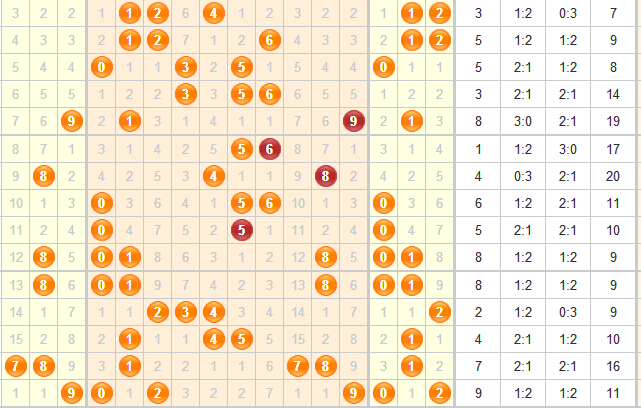 和值分析:分析近期和值走势,发现近期的和值算比较稳定,跳动幅度不大持续徘徊在第一区域与第二区域之间,近期小号持续走红,和和值普遍比较低,本期和值推荐在8-18之间。