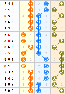 上期开出290,一大两小,两偶一奇,和值11,跨度9,200路,本期舍利子根据大小分布图结合基本走势图为大家分析推荐号码,本期推荐五码:01257