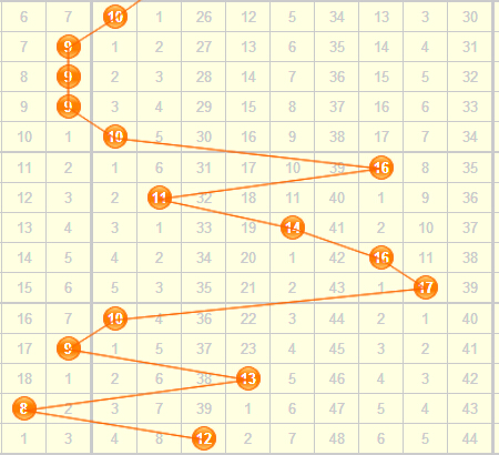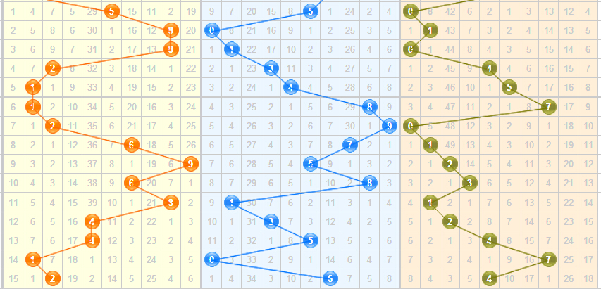 从和值走势图上可以看到,近期和值比较稳的,普遍在第二区域向左,近期跳动幅度不大,看好第二区域与第一区域交界面。本期和值推荐:9 10 11 14
