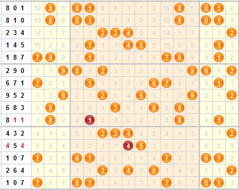 跨度分析:上期跨度为7,跨度值比较大,依据近期各区出号走势分析,估计本期跨度会往左边移动,重点防跨度3,其它推荐:1 4 5 8