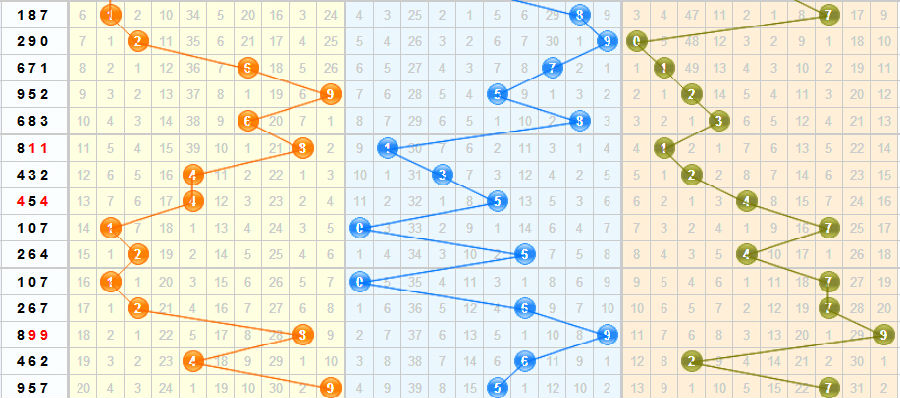 分析和值走势图可以看到,近期和值跳动比较大,大号在近期出现比较频繁,分析综合走势,和值应该会有所下降,本期还是看好第二区域的开出,本期推荐第二区域靠右,推荐和值:15 17