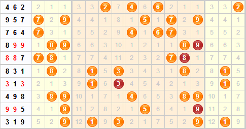 上期开出了319,期中2个号都是最近刚开出来过的,属于这个位置上之前比较冷的号,是对近期冷号的一个回补,可以考虑近期其他位置上的冷号的开出,可以关注下0,2,6。而9号球最近三期都有开出,根据近期走势来看一个号码连开3期以上的情况比较少见,所以本期不好看9的开出。重点关注024568。