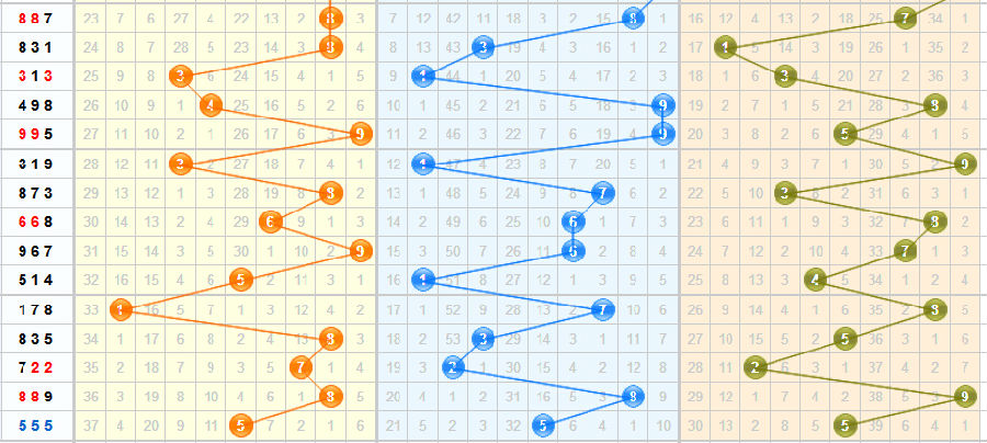 百位:从大小走势图上的百位上分析,前面连续开出大号,本期看好百位上大号的持续的开出。