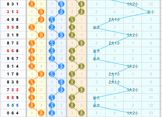 百位:从大小走势图上的百位上看,上期开出小号,百位上大号开出比较热,本期看好大号的开出。