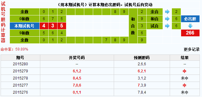 根据以上3D试机号试开走势图分析,今日3d试机号的开奖号码是435,结合走势图,本期重点看好3号球和4号球的开出,3d之家3d试机号胆码计算器推荐266,结合3d之家试机号试开走势图来分析,6号球是规律号球,本期看好6号球的开出,1号球连续10期未开出,本期10号球有回补开出的迹象,本期可以适当关注一下,本期3d试机号后分析专家北斗星重点关注:134567。