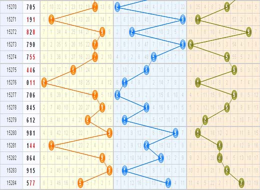 上期开出的和值是19,属于第三区间内的数,从走势图上看,和值19开出后的走势都是往左开,本期可继续关注和值落在第二区间内;综合推荐:12 15 16 17