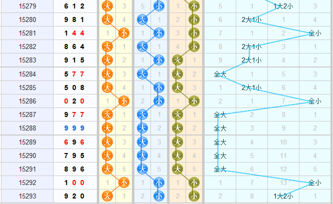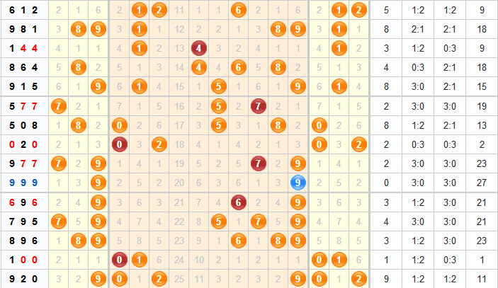 分析近期的和值走势,前面开出和值浮动较大,之前5期连续全大,之后开出全小,上期回归稳定,分析近期的走势,本期看好稳定的第二区域开出。本期和值推荐:9-19.