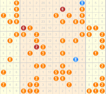 3、个位数是最难判断的,开出0到3、5、7、8有1次,重复1次。首先排除0路的号,再排遗漏期数多的4,几率小的1、7,本期选择2、5、8。
