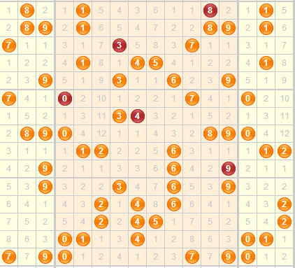 和值分析:近期和值探低后回升,总体偏于中低位,后期主防开出中段和值,关注中大位附近的和值回补开出,主要看好12-18点,