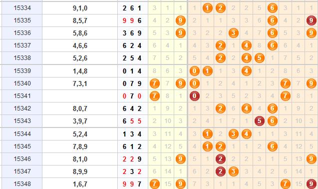 上期开出了997,开出了组三,已经连续3期开出了组三形态,本期推荐关注组六形态的开出;0号球目前间隔7期未开出,已经超出了它的出现周期,本期可重点关注它的开出;3号球目前间隔1期未开出,本期可适当关注它的开出;4号球目前间隔4期未开出,从走势图上看,近期4号球有在间隔4期之后开出的,所以本期可继续关注它在间隔4期之后开出;6号球目前间隔3期未开出,本期可关注它的开出;7号球是上期的开奖号码,之前有过连续开出,本期可继续关注它的开出;8号球目前已经连续15期未开出了,属于近期内的绝对冷号球,本期可重点关注它的爆冷开出;综合以上结论,本期推荐六码:034678