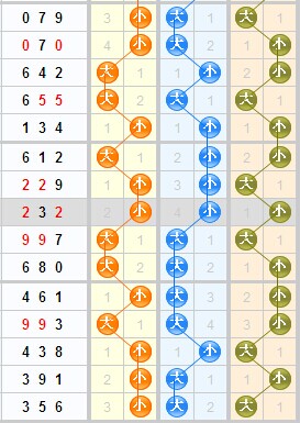 百位:在这个大小数争斗的情况下,百位上近期还是小数领先,从之前的走势看来小数有曾经连开三期以上的情况,所以本期开出小数的可能性比较大;