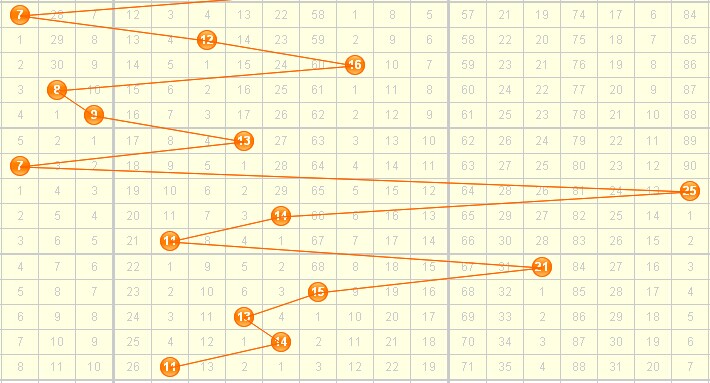 近期和值上波动不大,并且有越走越小的趋势,近期没有在三个区域内波动的走势。从之前的发展来看,在第二分区内发展4期以上的情况不多,所以近期开始可能会有大的振荡,所以本期的话建议关注大振幅的走势,推荐和值为:7 9 11 12 18 21