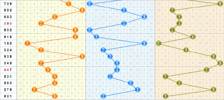 百位:分析近期的百位走势图,百位上期开出的是5号,近期5号虽然在百位上开出较火,但是综合分析,本期不看好它的开出。1号当前有一期没开出,分析1号的走势,前面开出隔了16期,本期不看好它的隔期开出。0号和6号都是较长时间没开出,在百位上都较冷的号码,本期不看好它们的开出。本期百位推荐号码:134789