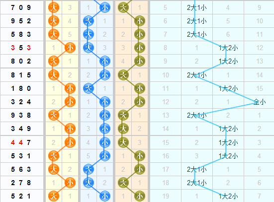 个位:分析近期的个位大小走势图,上期个位上开出小号,本期看好个位上的大号的开出。