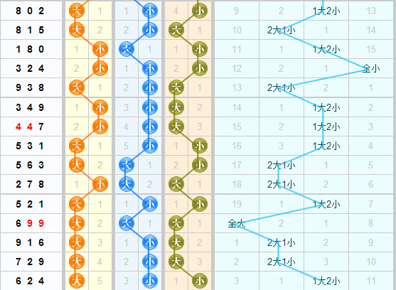 分析近期的和值走势图,上期和值是12,落在了第二区域上,分析近期的和值走势,起那么几期中大号开出,和值相对开出大和值,前面除了一期开出较大和值,其他都是比较稳定,分析近期的大小走势,前面持续大号,上期开出两小一大,本期看好小号的开出。本期和值推荐:9-19.