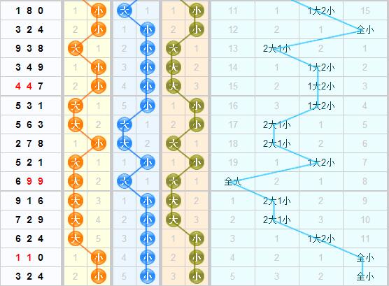 百位:分析近期的百位大小走势图,百位前面持续开出两期的小号,分析大小走势,本期看好小号的继续开出。