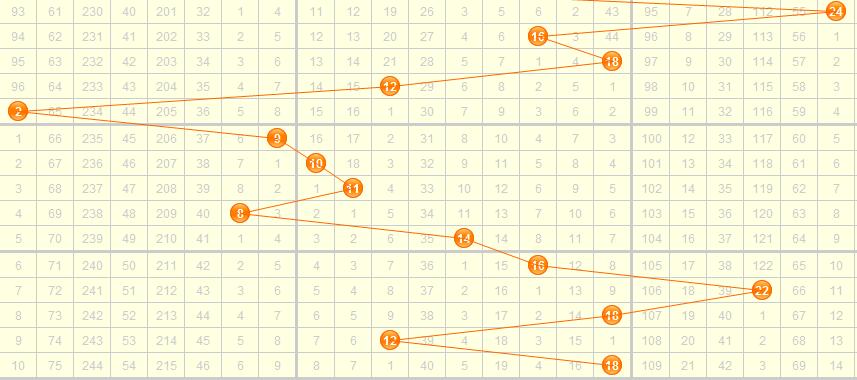 分近期的和值走势图,近期的和值走势跳动幅度很大,从近期的大小分析,近期的大号持续开出,所以和值都偏向大和值。本期和值推荐:10-23.
